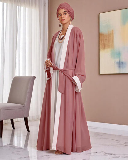 Stylish Design: Open shrug with contrast panels adds a modern touch to the traditional abaya.
