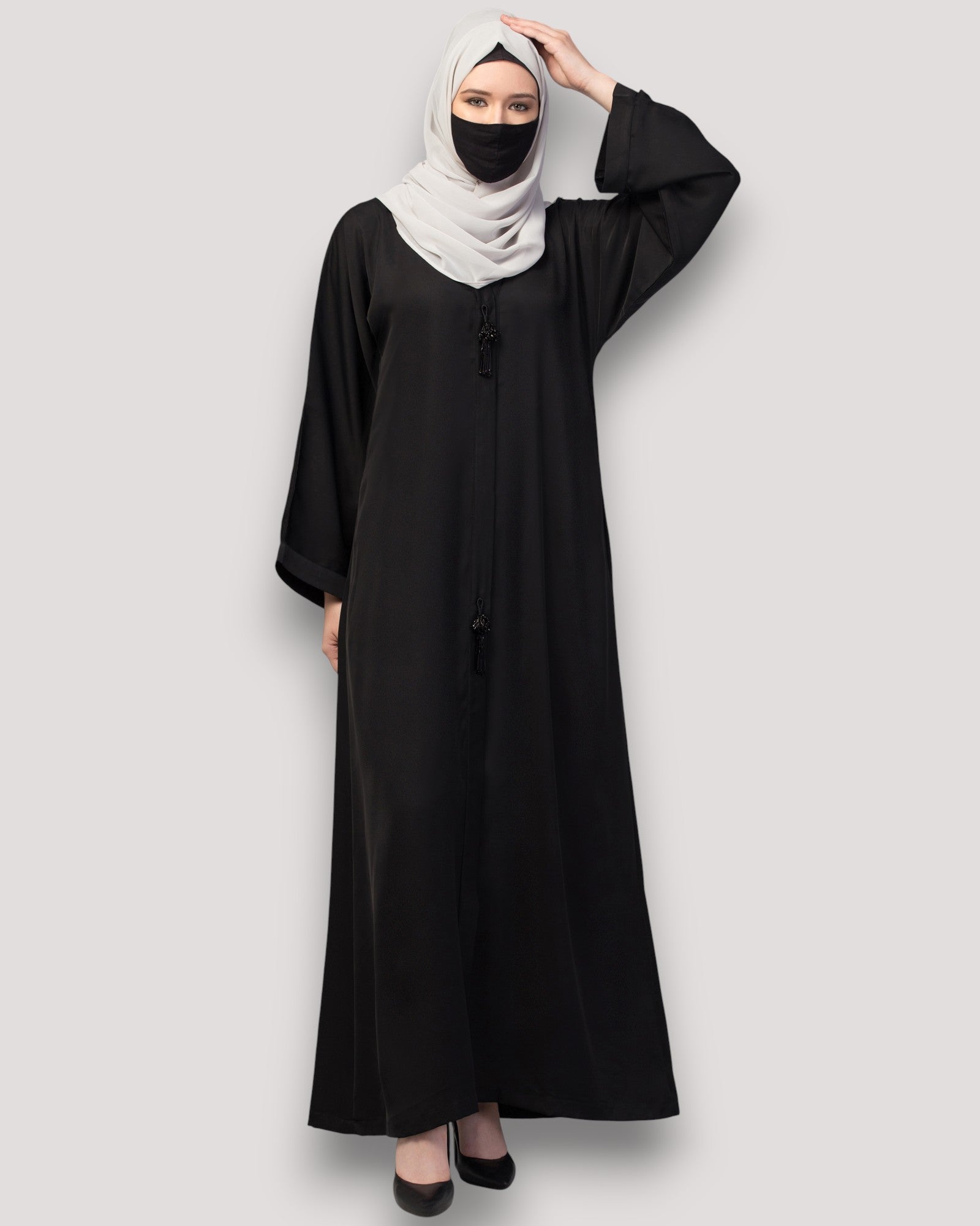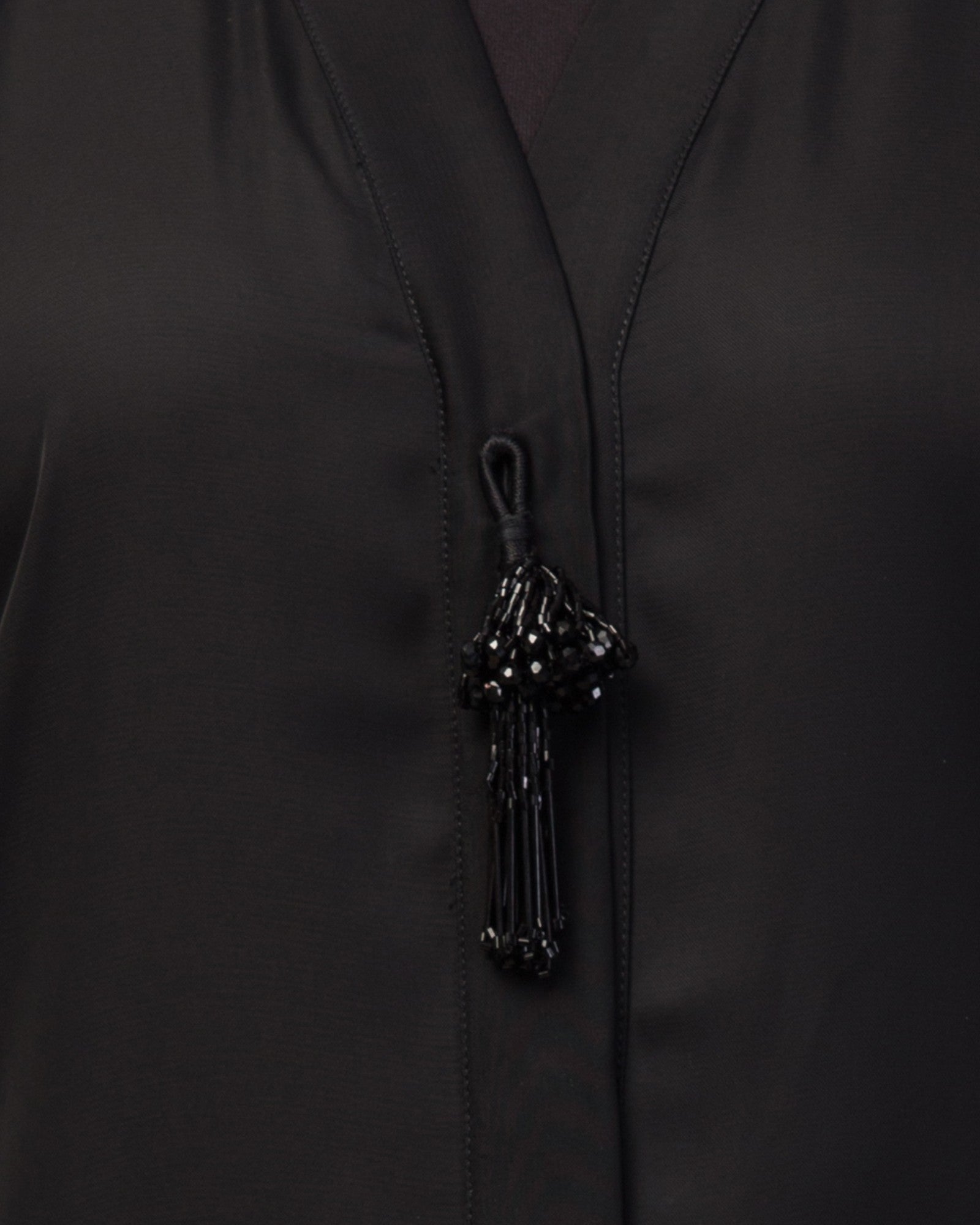 Front Open Abaya In Premium Praada Fabric With Embellished Tassels