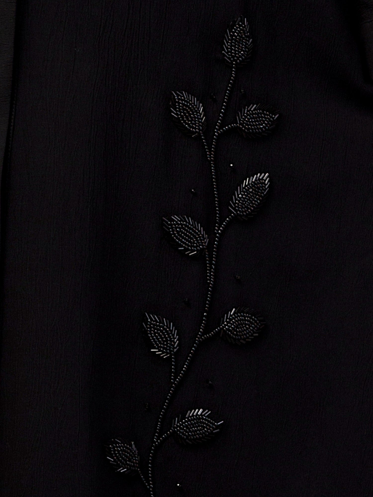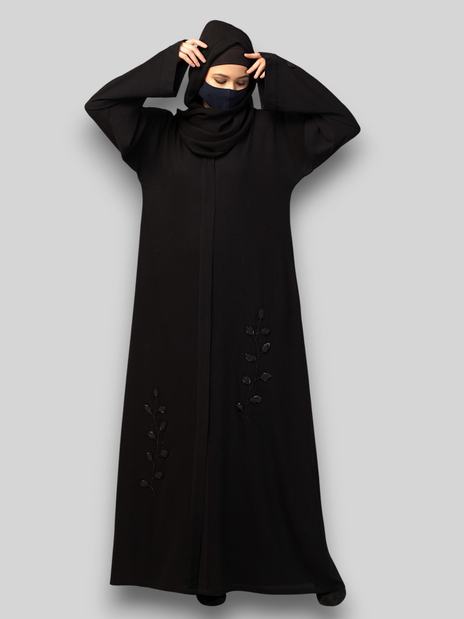 Delicate handwork embellishments adorn the front panel and sleeves, featuring intricate black beadwork in floral vine patterns that add refined detail without overpowering the classic silhouette. This Black abaya with Handwork flows gracefully in an A-line cut, providing full coverage and effortless movement—perfect for daily wear, office looks, or special occasions.