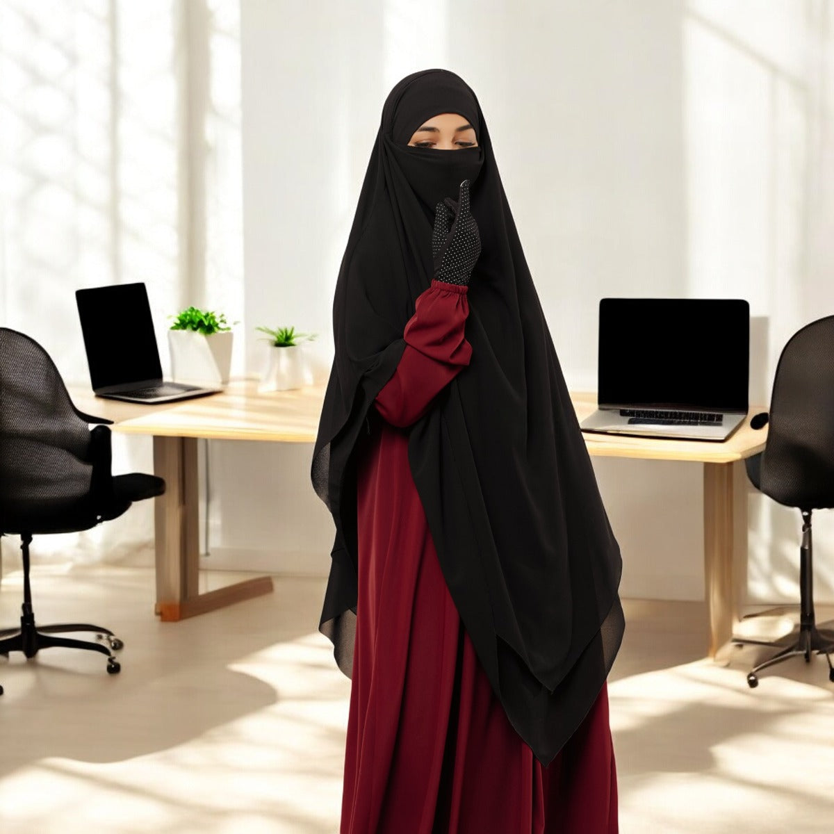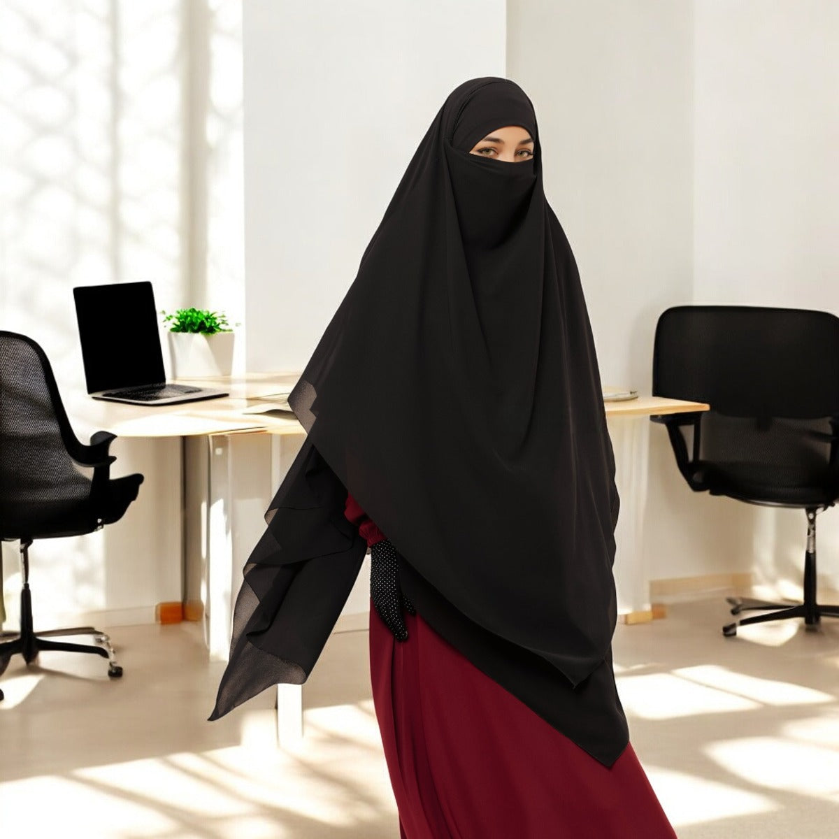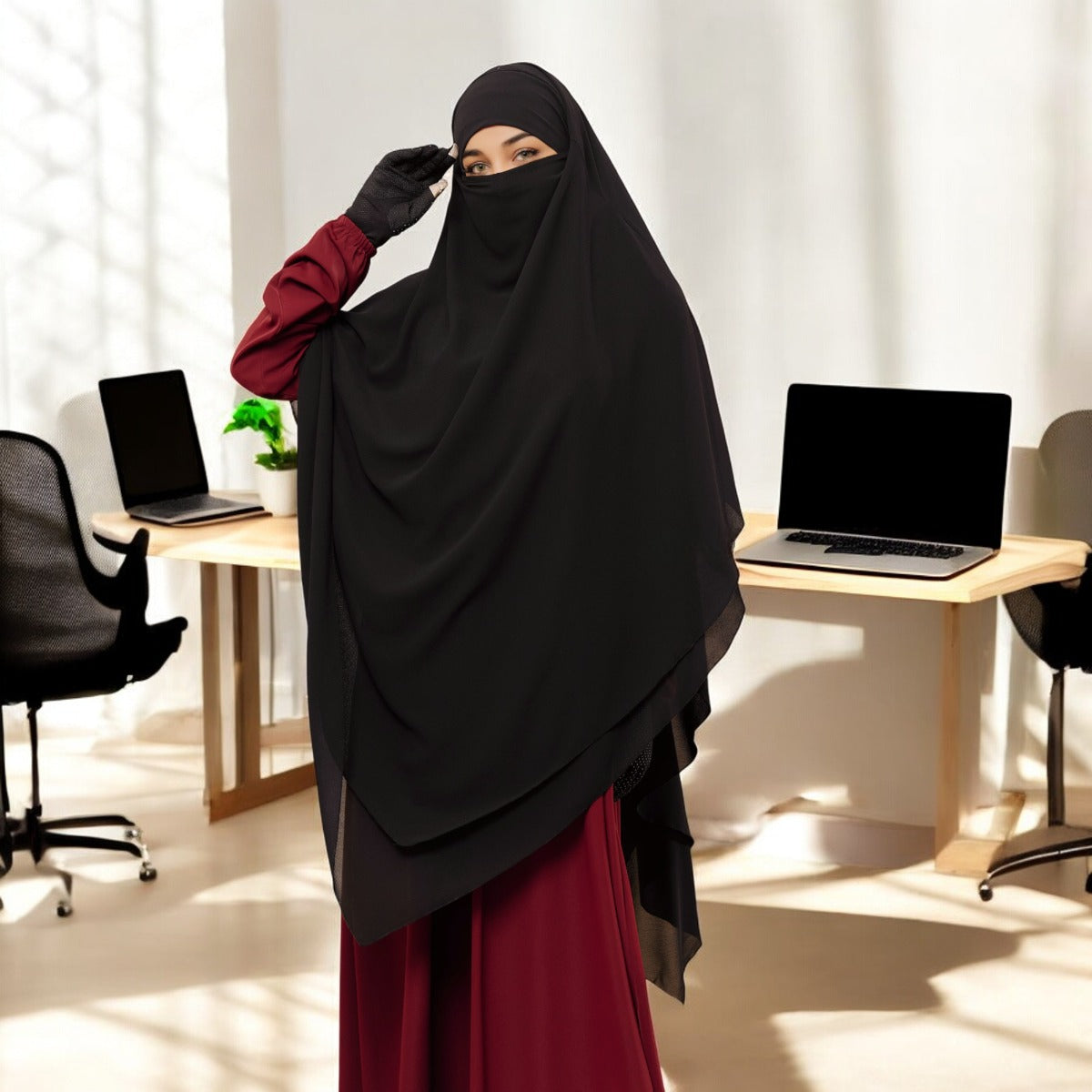 Bashariya Black Color Three-Layer Triangular Long Prayer Khimar Hijab with Attached Mouthpiece|Short Jilbab