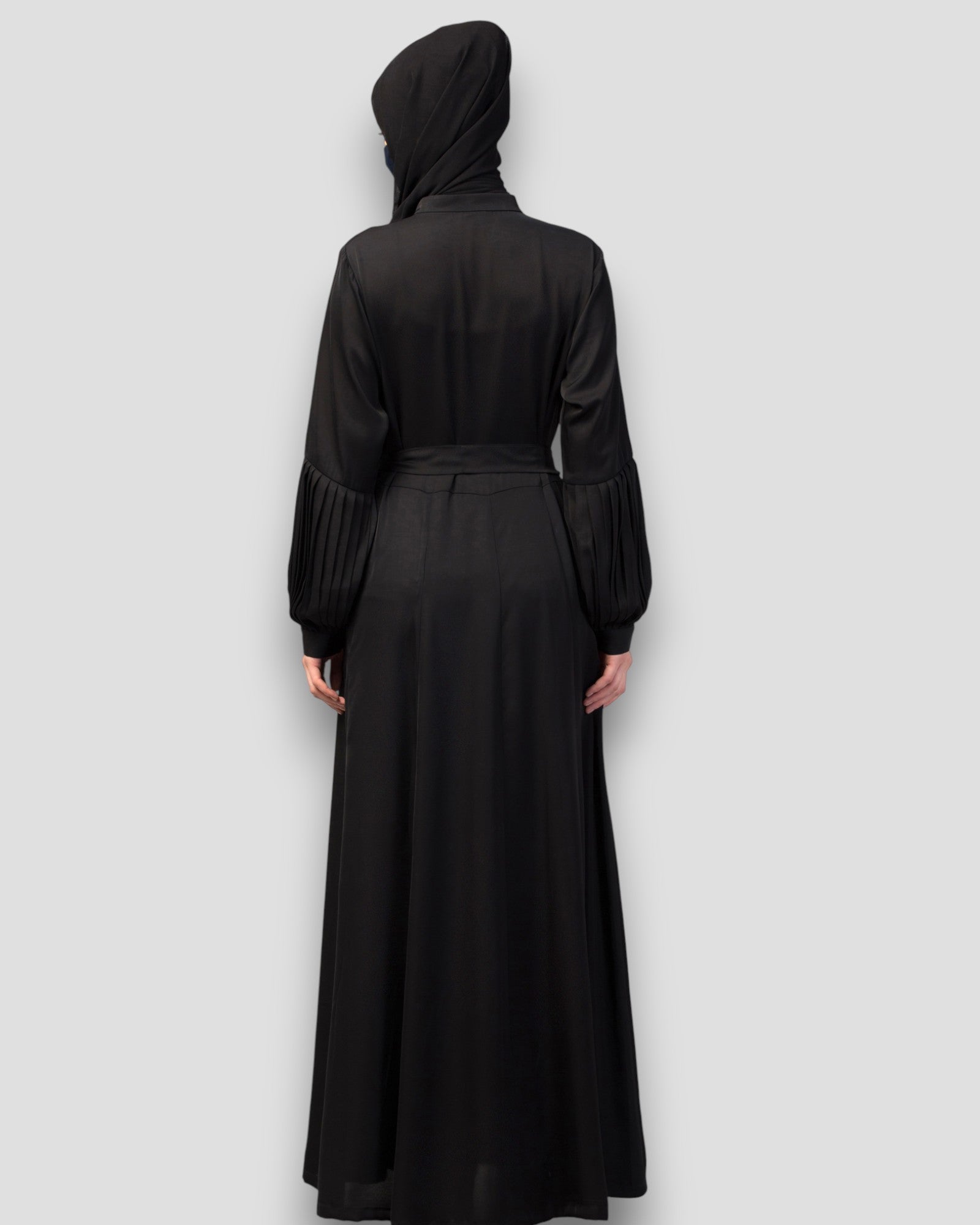 Designer pleated sleeves with cuffs bring volume and graceful movement, while the umbrella flare silhouette ensures modest coverage and a flowing drape. A removable belt offers styling flexibility—wear it cinched for a tailored look or without for relaxed modesty. Practical side utility pockets add everyday functionality, and a complementary hijab completes the coordinated ensemble.