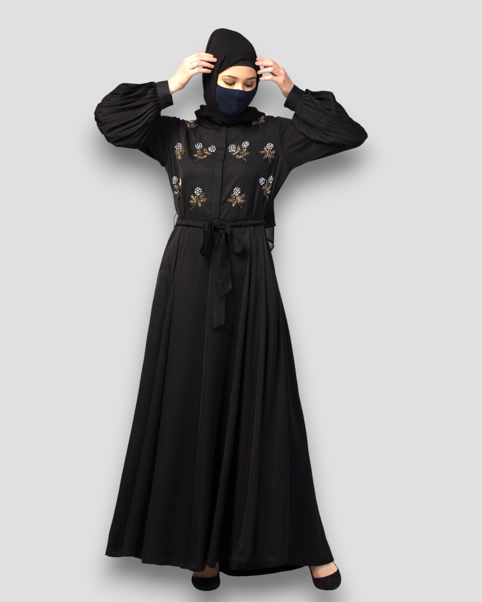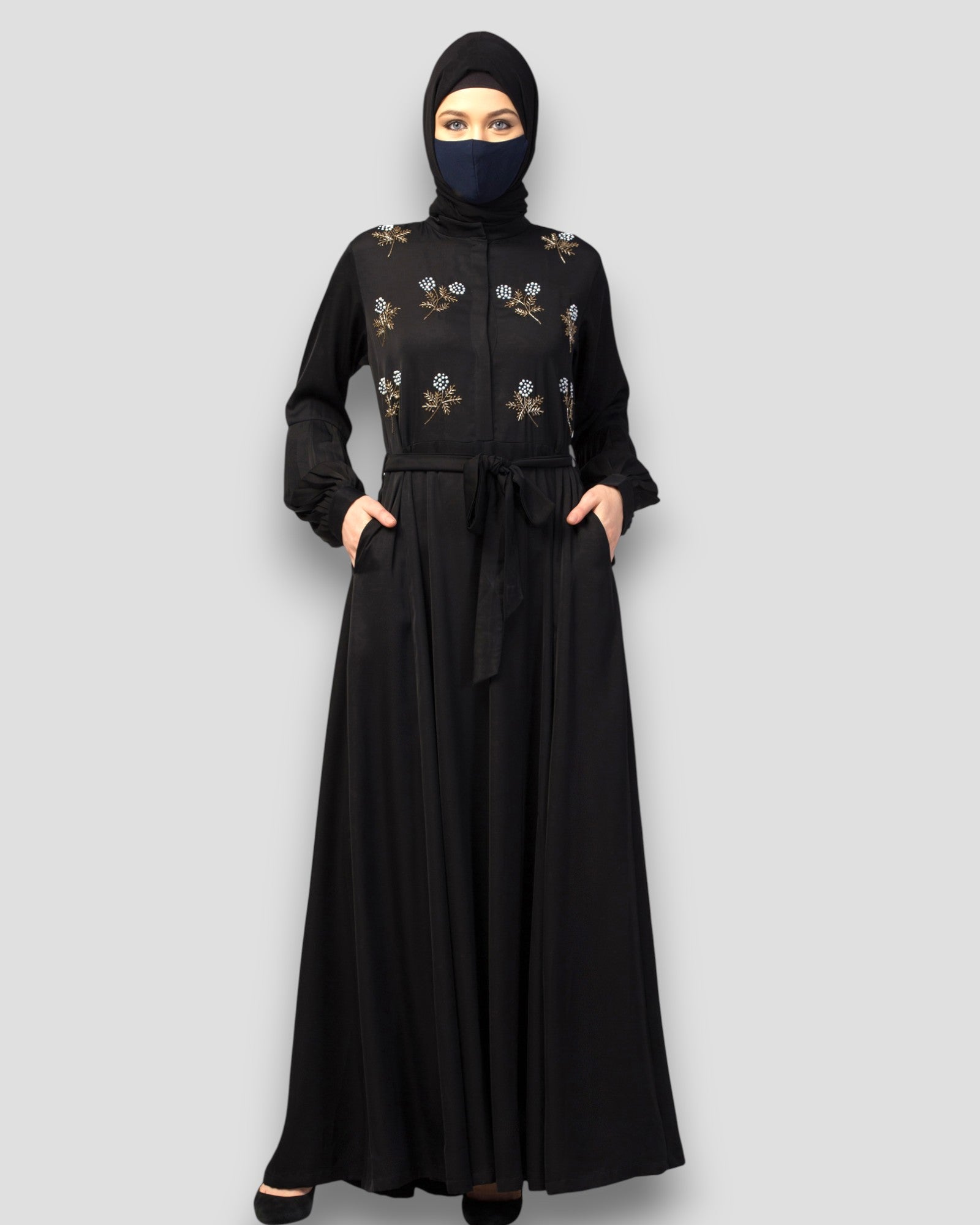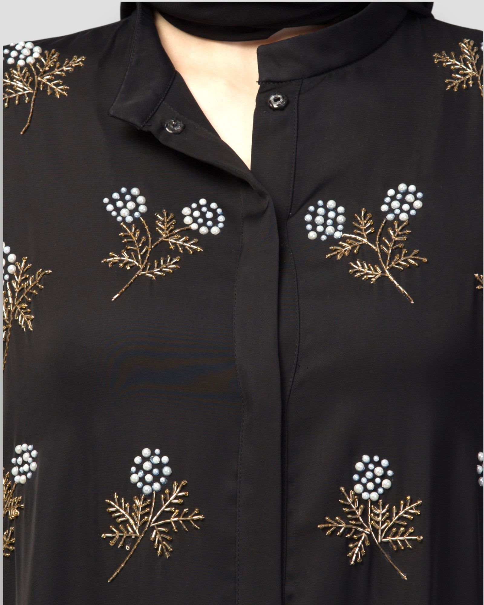 Explore the finest premium abayas online with this exquisite black abaya, crafted from luxurious imported Nida fabric for ultimate comfort and elegance. The intricate handwork embellishments featuring pearl and gold thread floral motifs on the yoke add a sophisticated touch, making it a standout choice among premium abayas online.