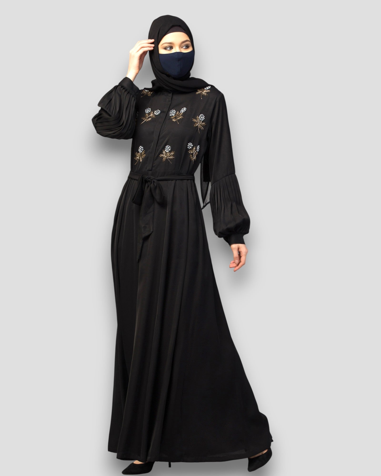 Premium Abayas Online - Black Embroidered with Pleated Sleeves & Belt