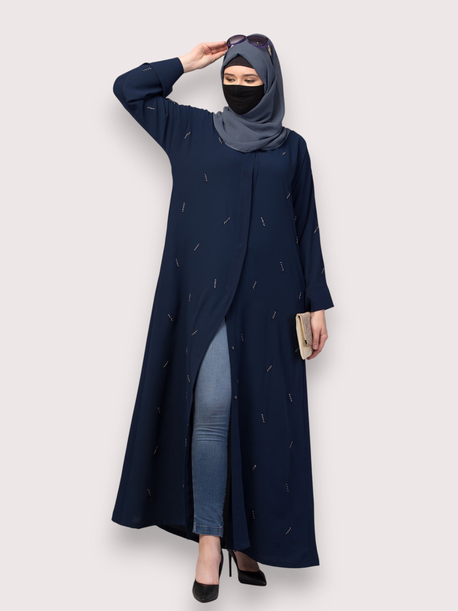 Navy Blue Front Open Abaya with Handwork – Premium Praada Fabric