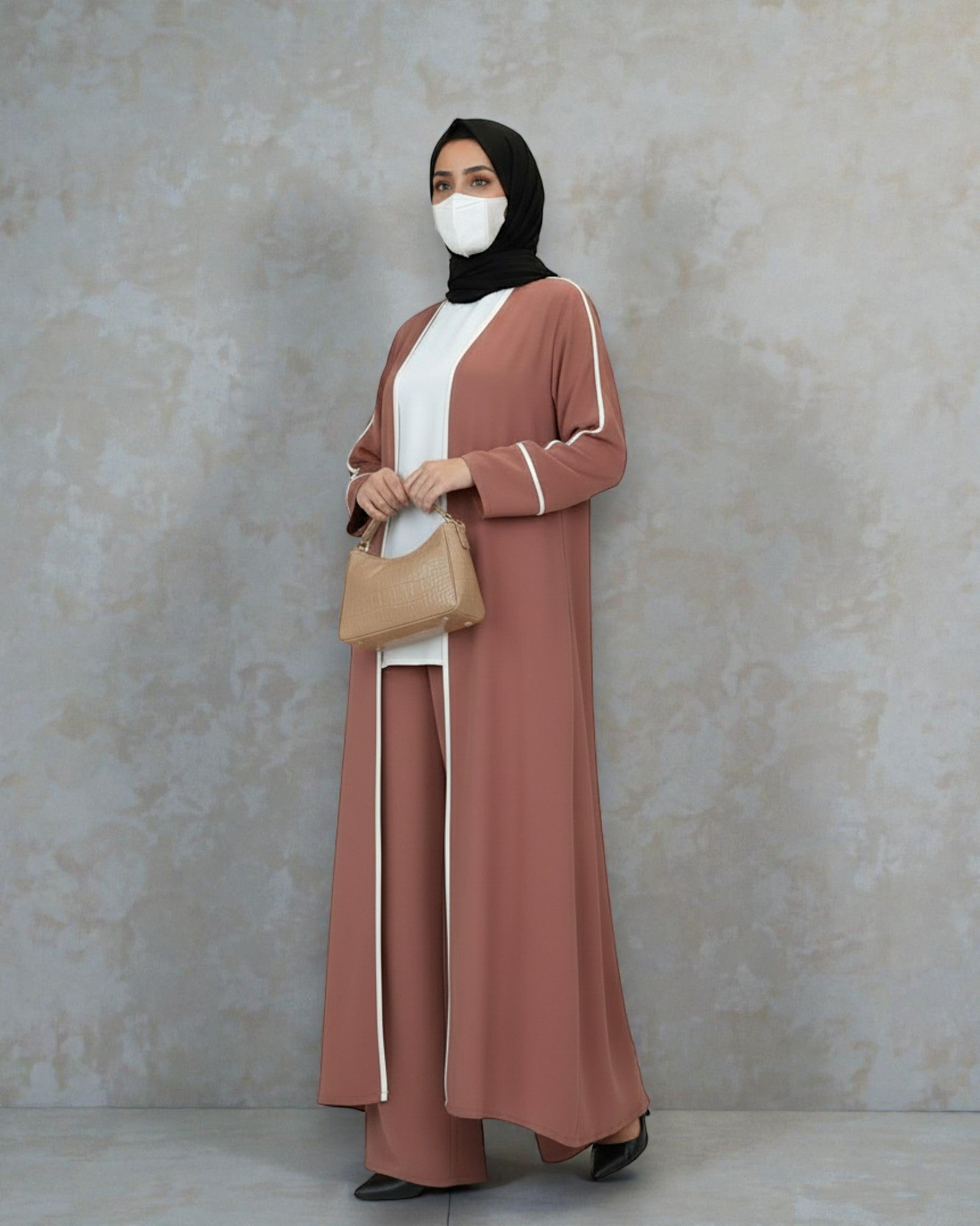 This premium four-piece modest co-ord set features a sleek short top and straight-fit pants layered with an elegant abaya-style open shrug highlighted by refined piping details, paired with a matching hijab stole for a polished finish. Crafted for fluid drape, comfort, and everyday luxury, this modern modest wear set creates a graceful silhouette that blends contemporary style with timeless elegance—perfect for daily wear, gatherings, and elevated casual looks.