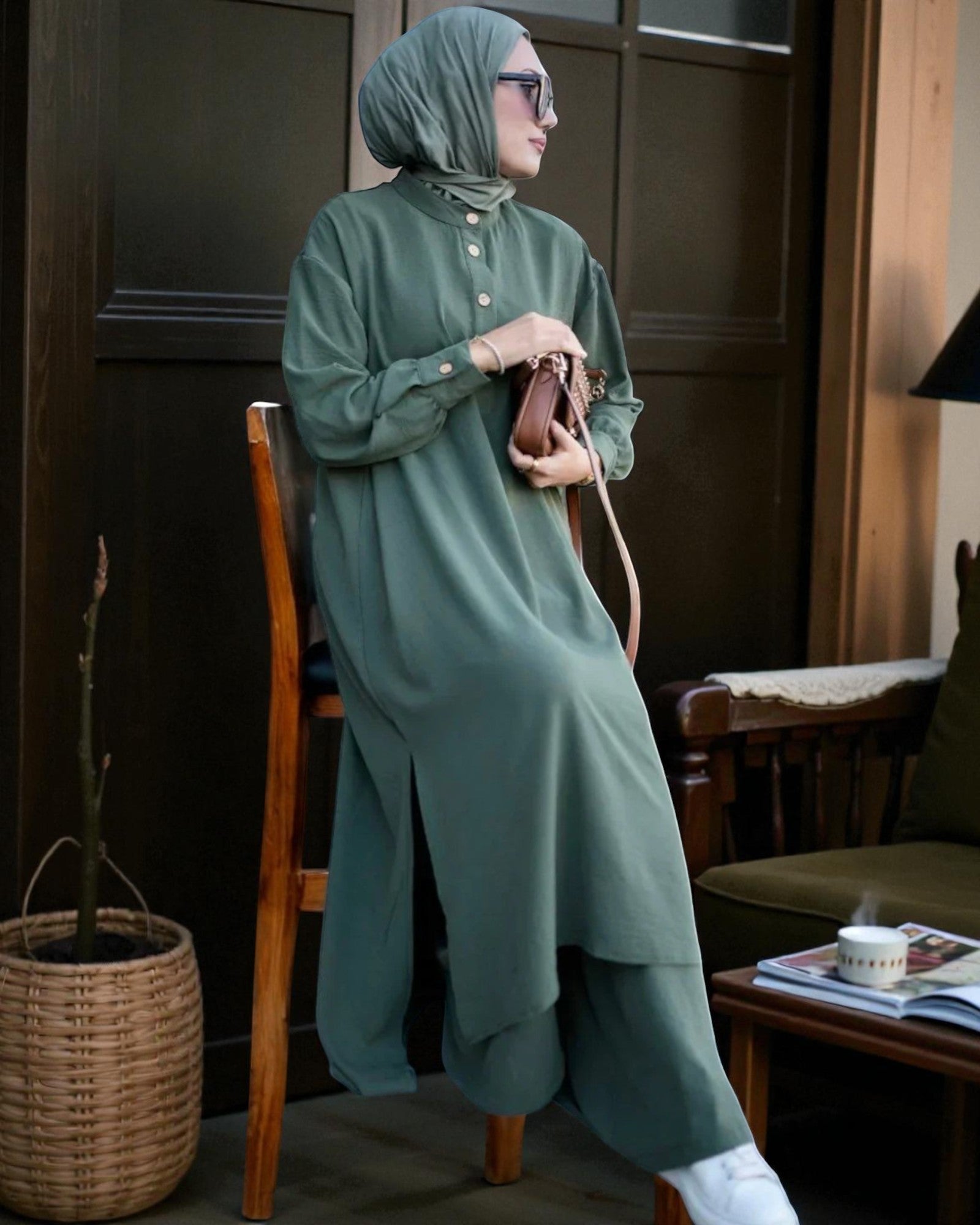 Step into effortless elegance with this premium Co-ord Abaya Set crafted from soft Firdaus fabric. The set features a pair of ultra-wide flared palazzo pants with a comfortable elasticated waistline, paired with a long tunic designed with chic cuff sleeves and a mandarin collar. Perfect for everyday wear or semi-formal occasions, this modern abaya set blends comfort with style, making it a versatile must-have for your modest wardrobe. (Hijab not included).
