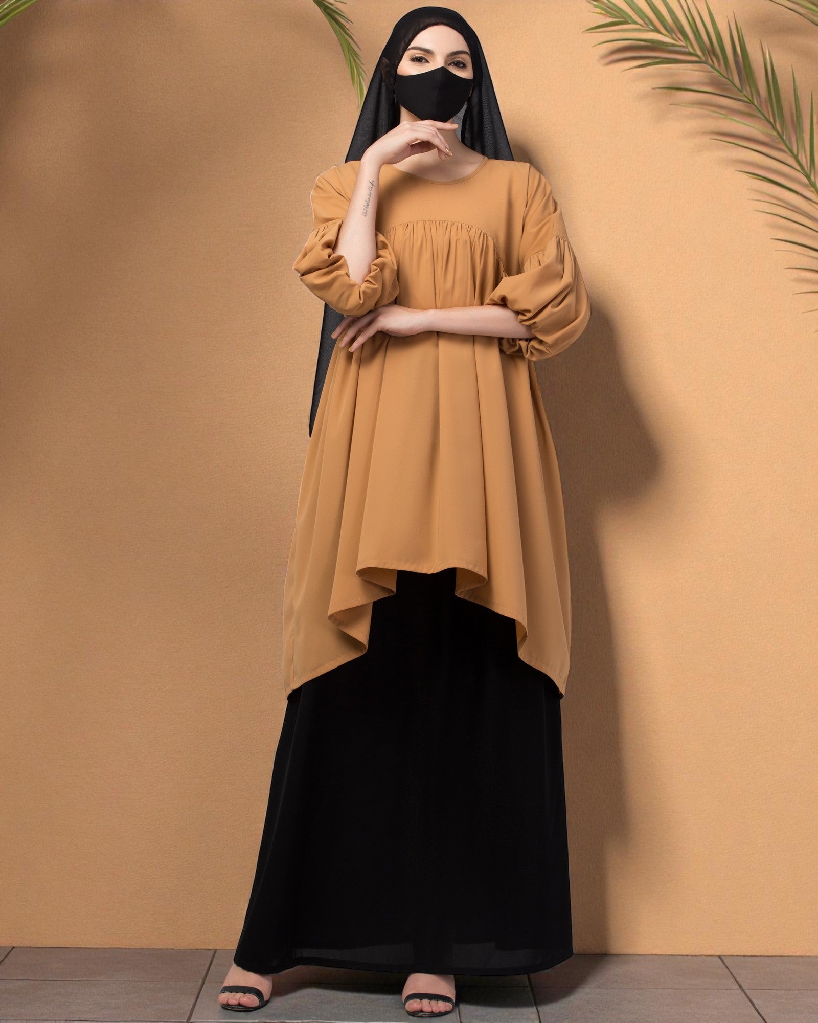 Modest Co-ord Set: Designer Long Top with Balloon Sleeves and Flared Skirt