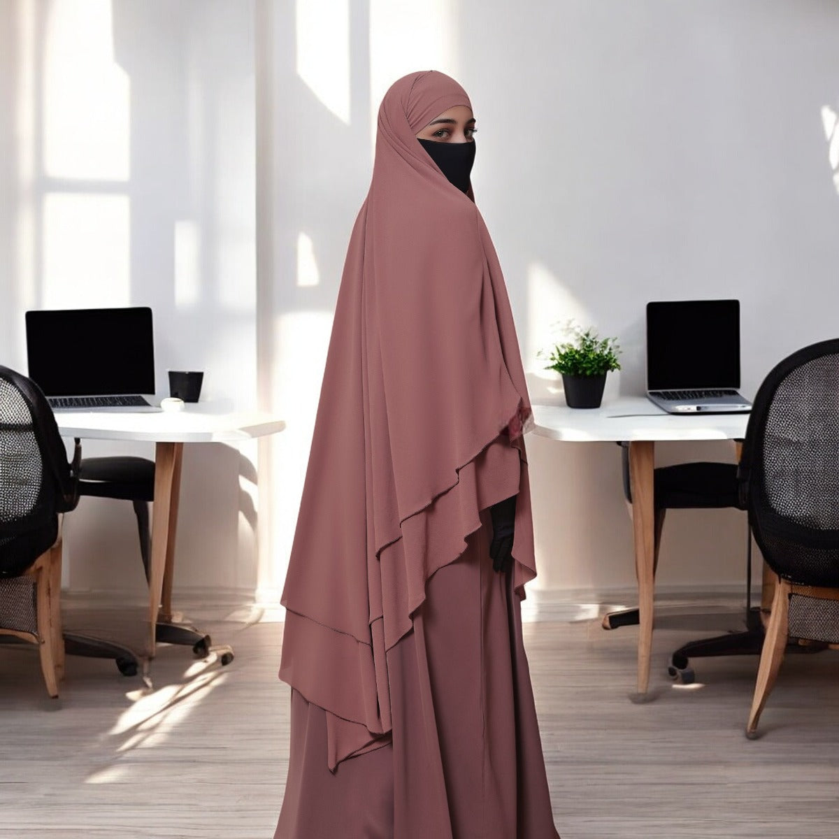 Bashariya Puce Pink Color Three-Layer Triangular Long Prayer Khimar Hijab with Attached Mouthpiece|Short Jilbab