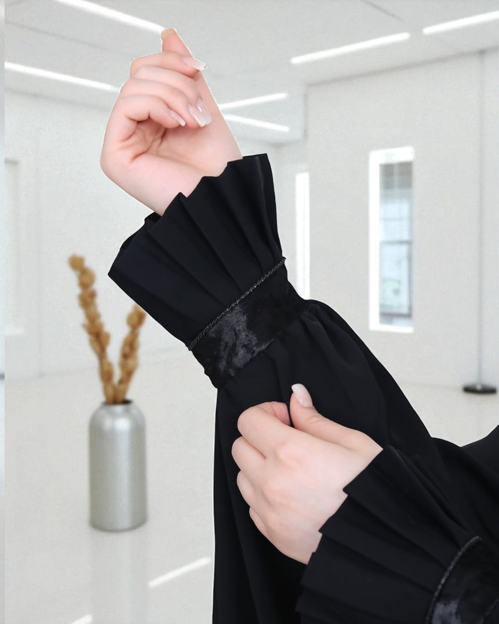 This Irani Abaya is tailored from luxurious Firdaus fabric, known for its lightweight comfort and graceful fall. Designed for complete coverage, it flows effortlessly with a loose, modest silhouette that ensures both elegance and ease of movement. The standout detail lies in the pleated cuffs, finished with subtle textured accents that add refinement without overpowering the simplicity of the design. Perfect for prayer, daily wear, or formal gatherings, this Irani Abaya brings together practicality, sophistication, and timeless modest style. Crafted for long hours of wear, the Firdaus fabric keeps it breathable and comfortable, making it a versatile wardrobe essential.