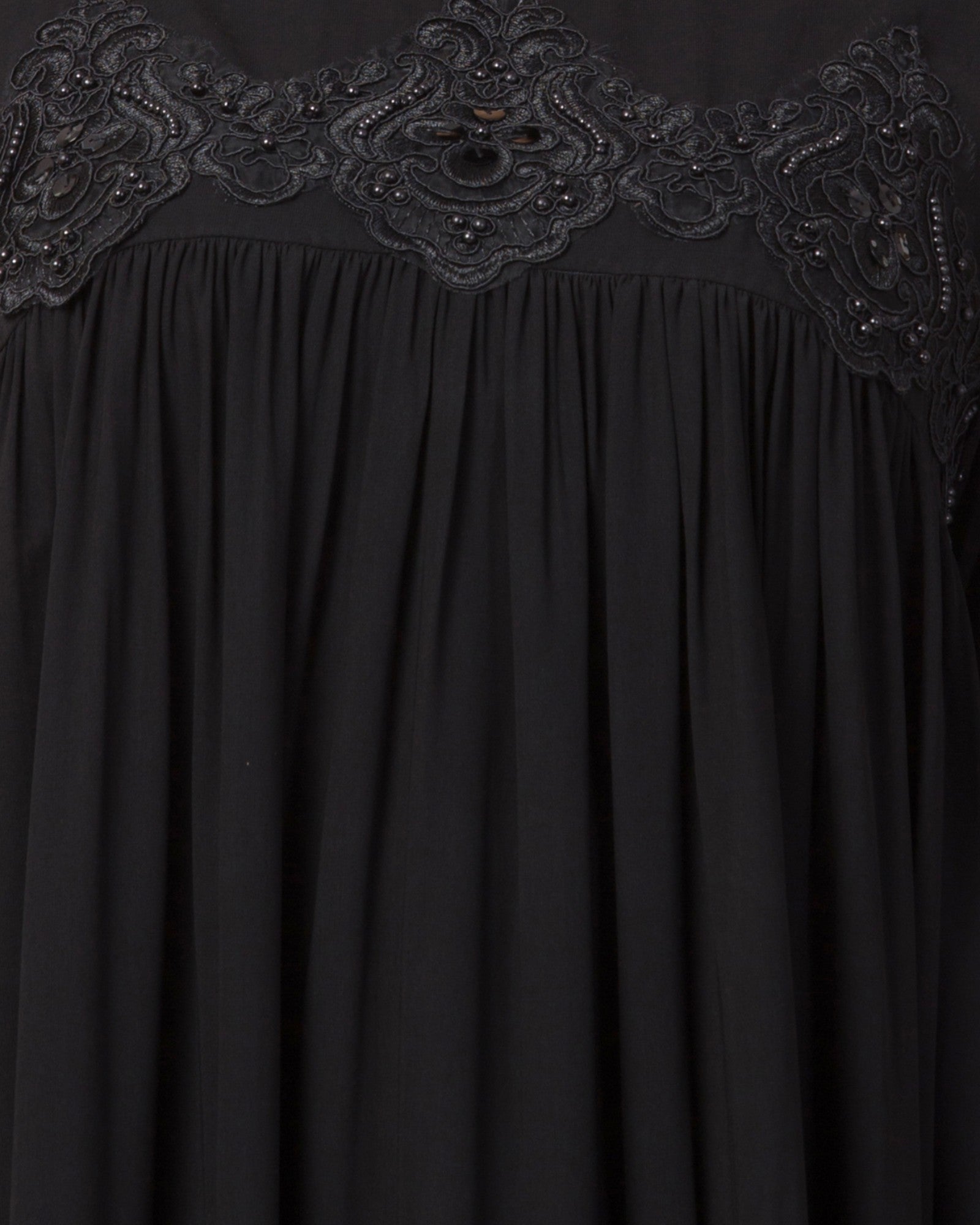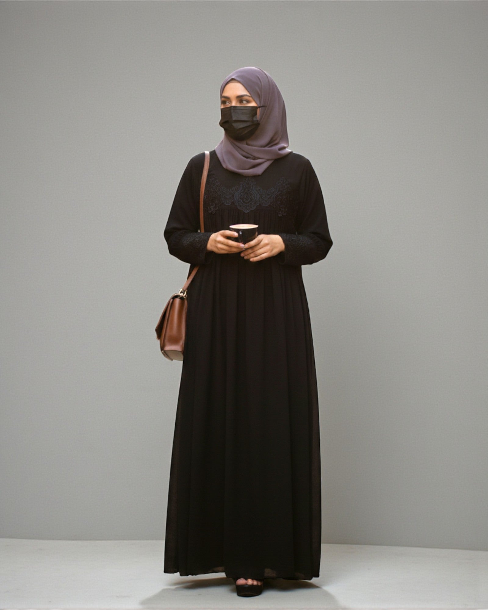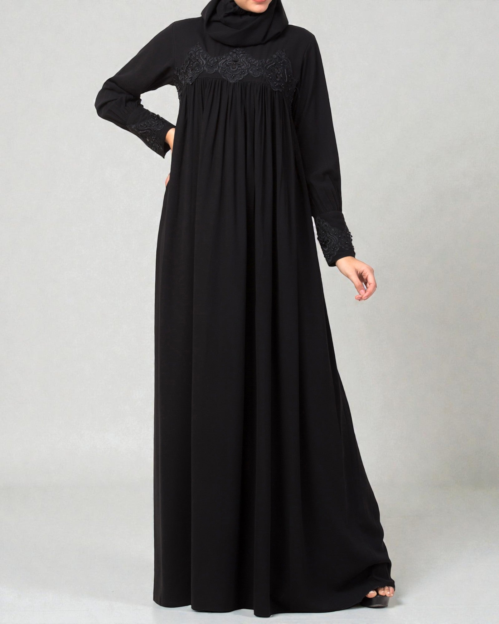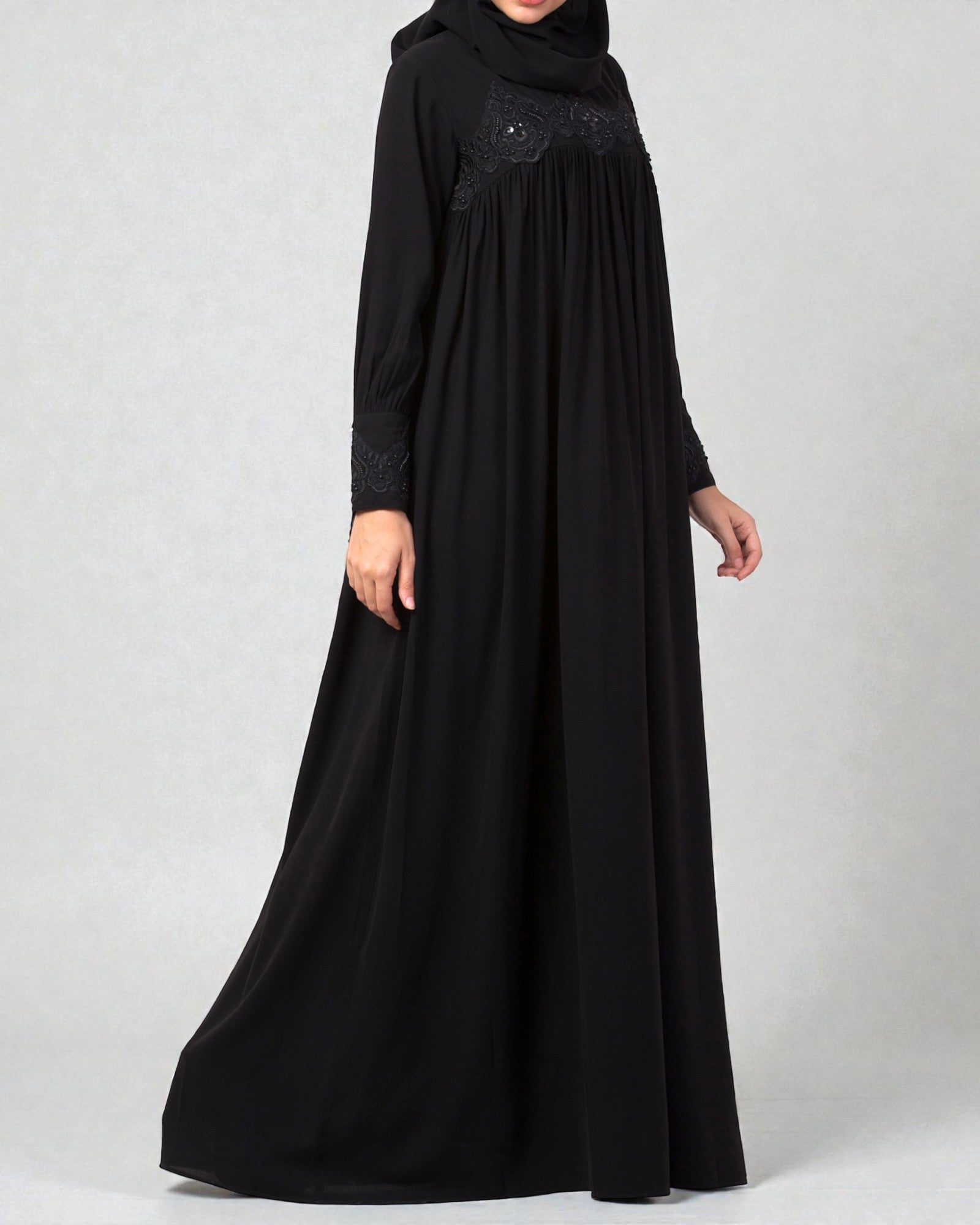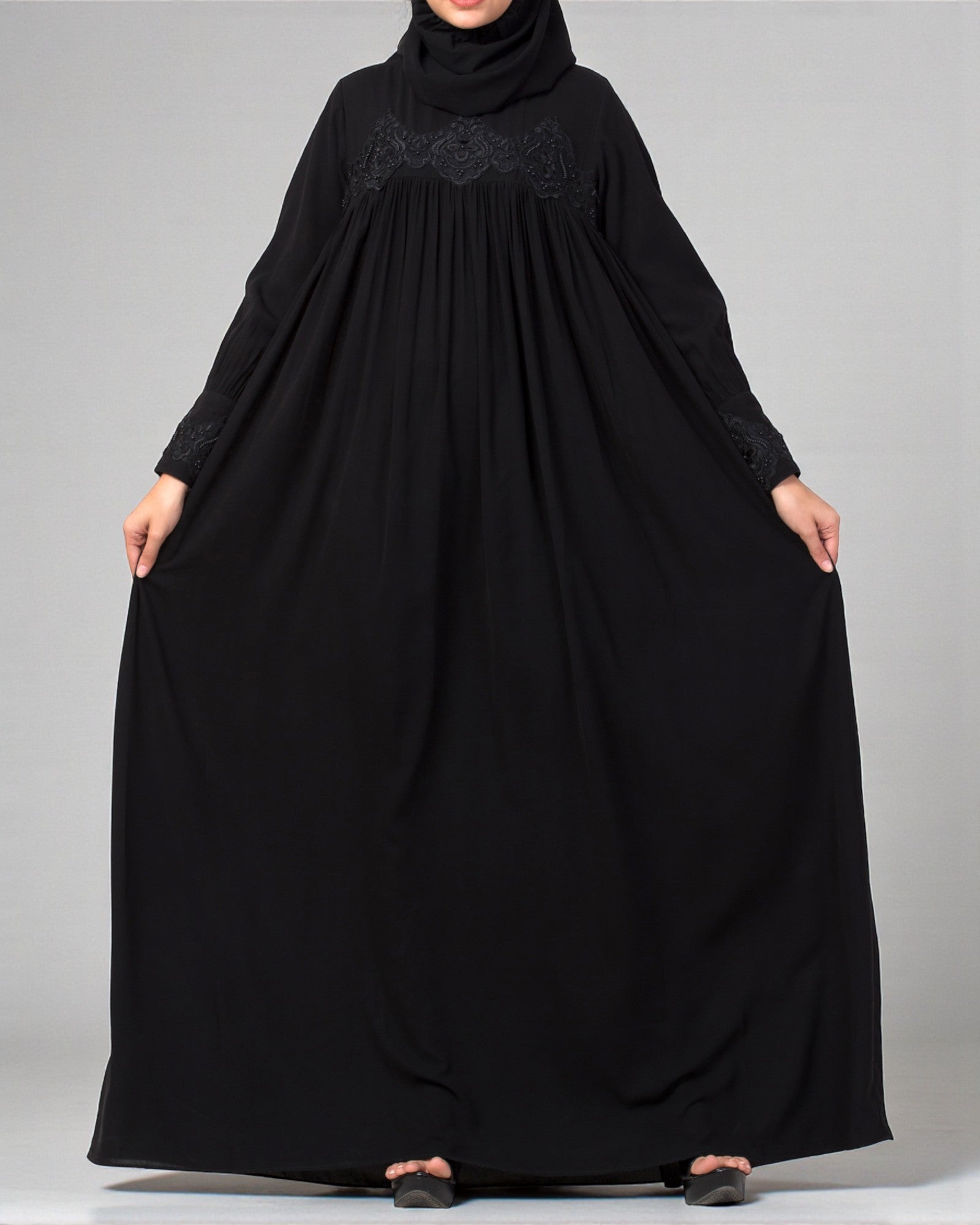 If you dont want to wear black simple abayas and prefer to wear something fashionable which is modest and looks like a dress then this could be the right choice for you. This is a lose fit 'Abaya Like Dress' which can be used as a daily wear or for a special occasion. Beautiful black lace work on yoke and sleeves makes it more fancier.