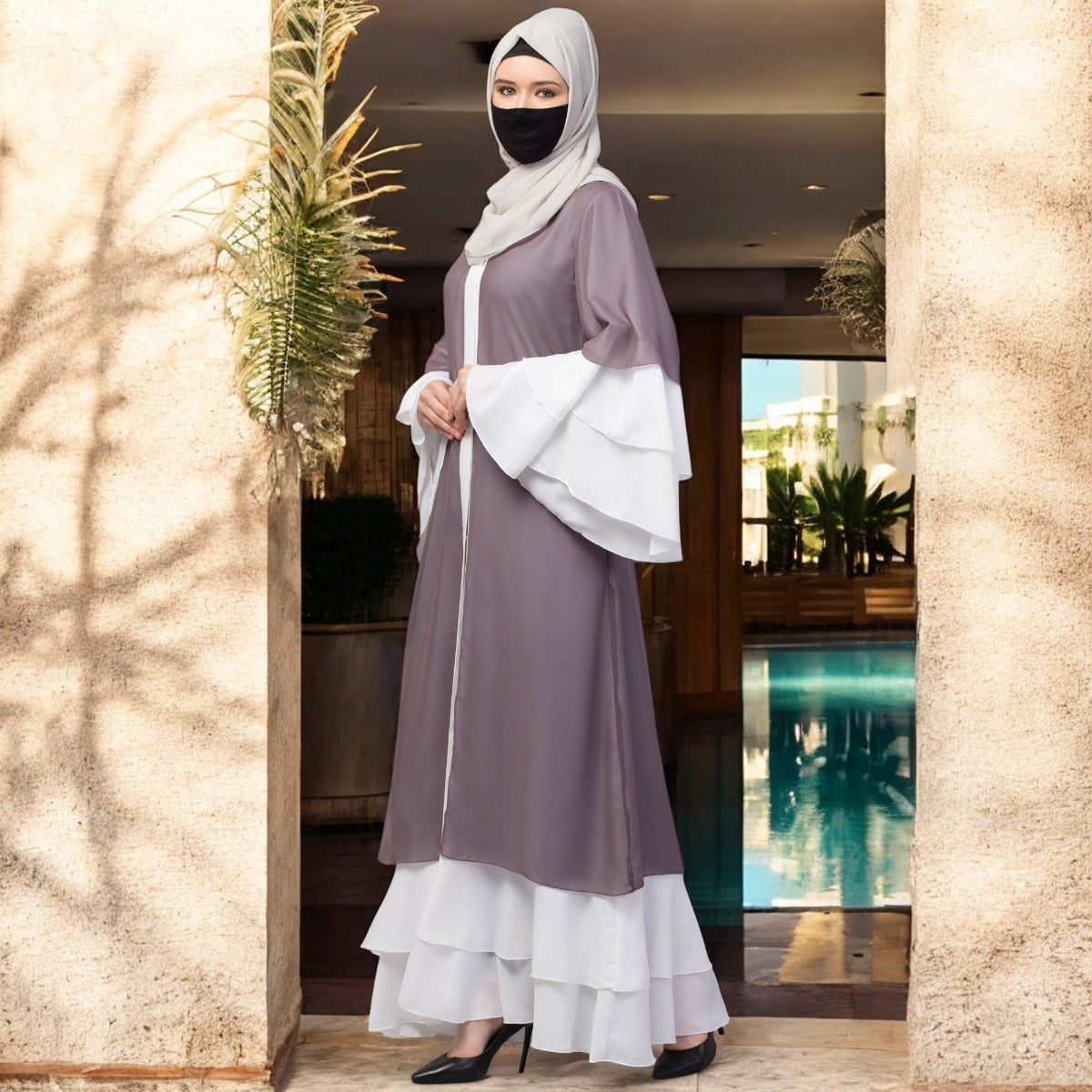 This stunning multi-layered, front-open modest abaya dress is expertly crafted from premium Firdaus and Georgette fabric. Paired with a chic white hijab, it embodies both style and comfort, making it an essential choice for any occasion. Experience the perfect blend of elegance and practicality with this must-have garment.