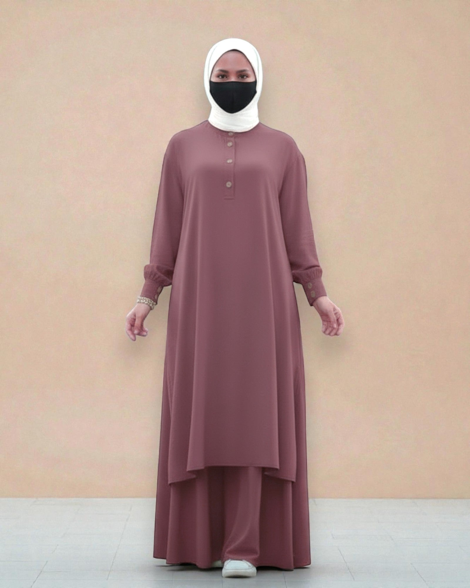 Step into effortless elegance with this premium Co-ord Abaya Set crafted from soft Firdaus fabric. The set features a pair of ultra-wide flared palazzo pants with a comfortable elasticated waistline, paired with a long tunic designed with chic cuff sleeves and a mandarin collar. Perfect for everyday wear or semi-formal occasions, this modern abaya set blends comfort with style, making it a versatile must-have for your modest wardrobe. (Hijab not included).